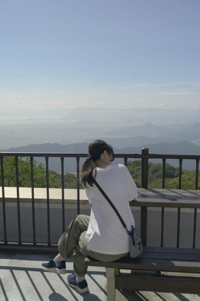 展望台で休憩する、ウチのモデルさん。絶景を眺められて、ご満悦の様子でした。