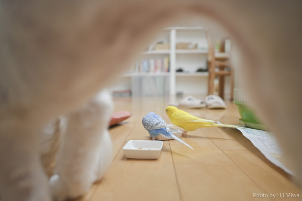 愛鳥たちとのコラボレーションです。主題は愛犬ではなく、愛鳥の方ですね。愛犬は額縁構図に利用されています。(笑)