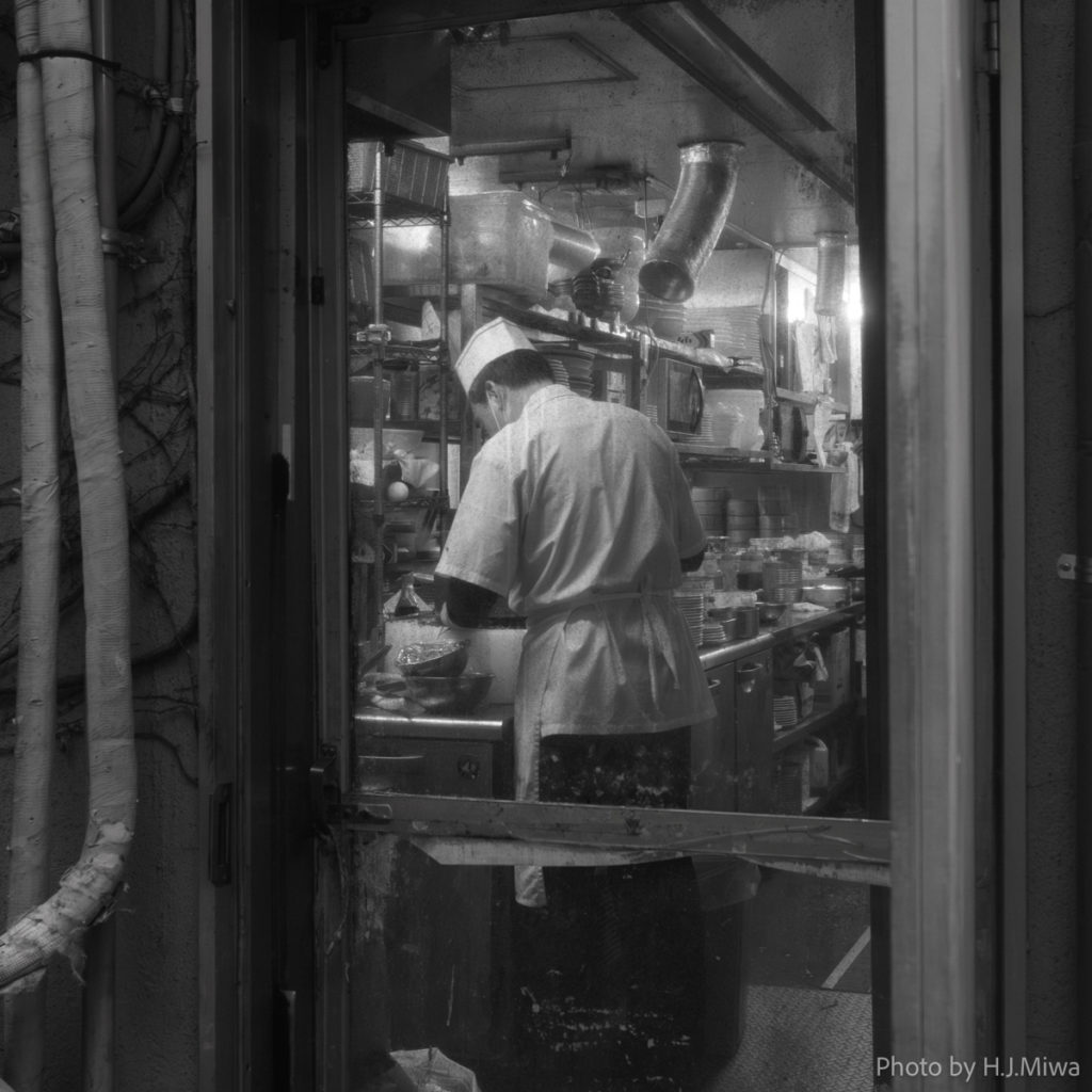 こちらも同じく横浜…のはずです。細い路地を歩いていたところ、ふと裏口から調理師さんの様子が見えたので、シャッターを切りました。