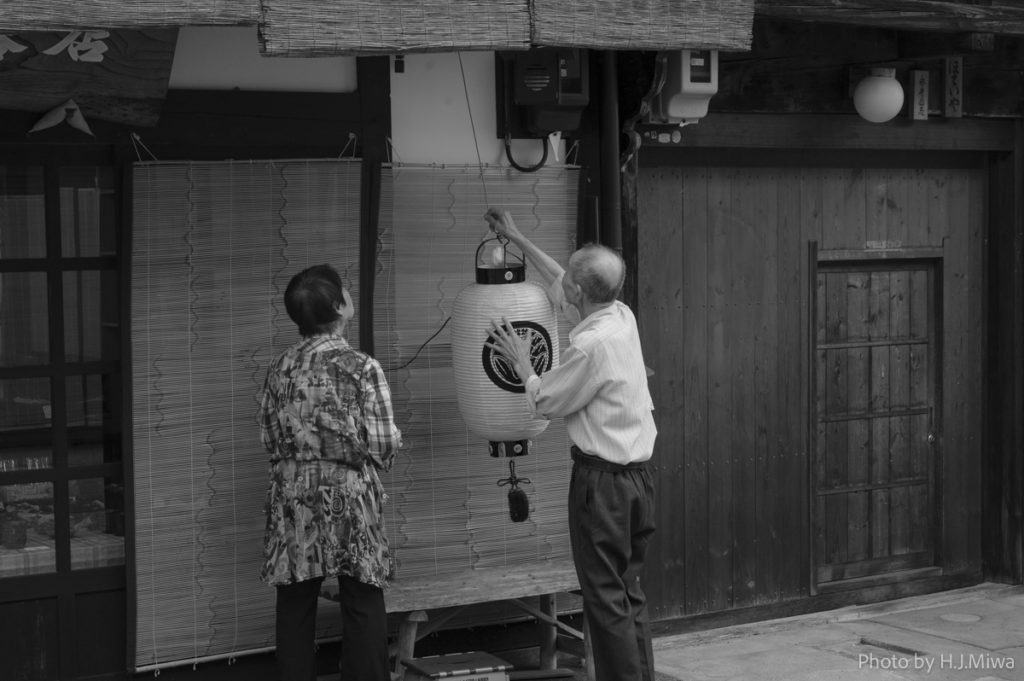 長野県西南部の宿場町「奈良井宿」にて。まだ明るい時間帯でしたが、夕暮れ前に提灯の明かりを灯す準備をされておりました。