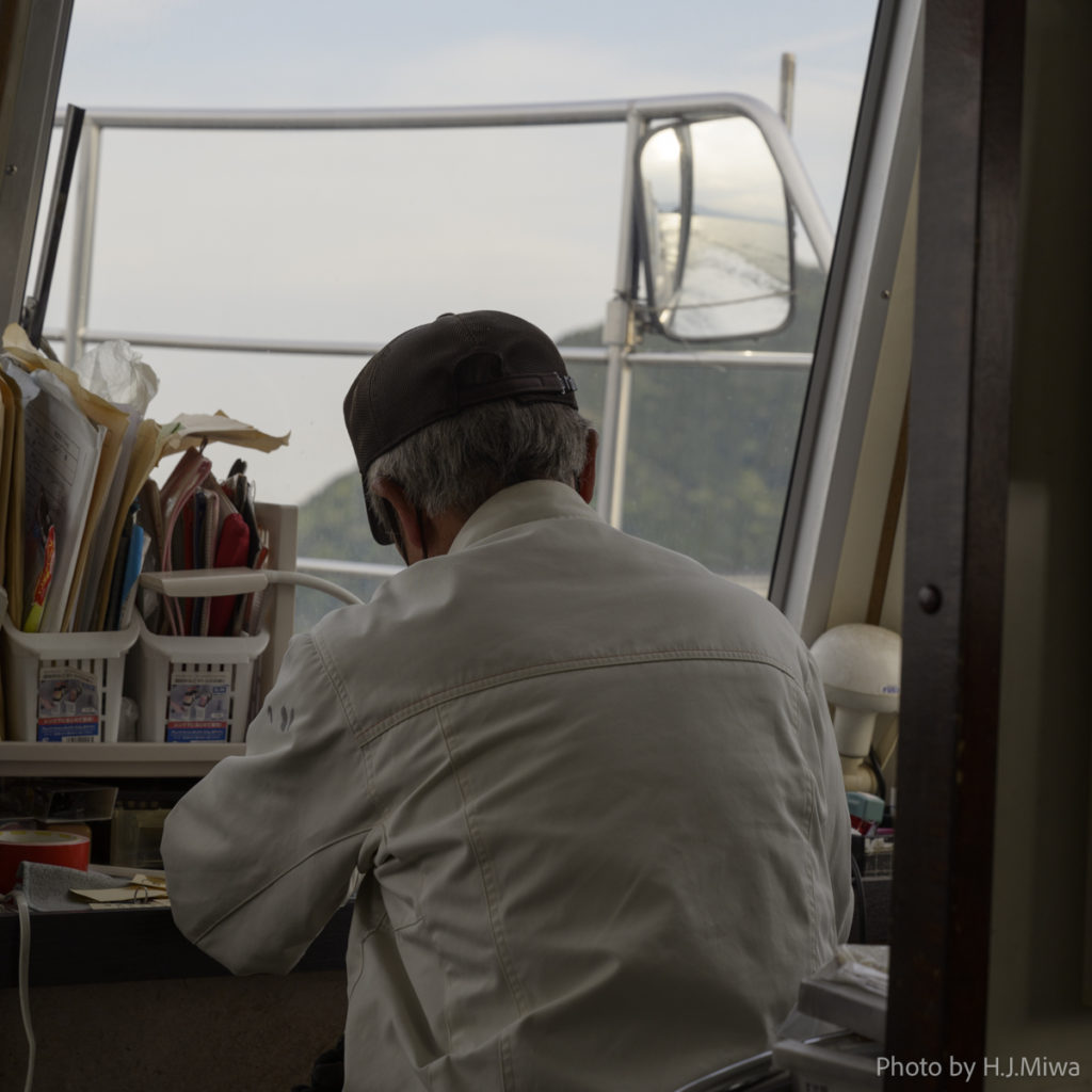 こちらも沖島に行った時の写真です。堀切港と沖島を結ぶ通船の操縦士さんです。