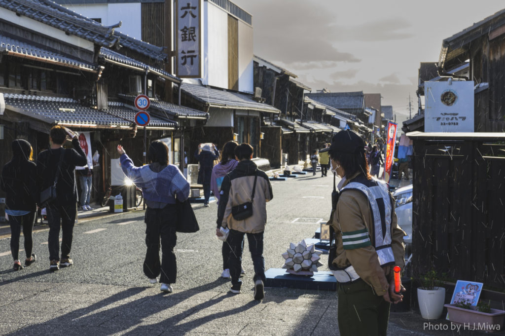 美濃市「うだつの上がる町並み」にて、年に一度開催されるあかりのアート展に訪れた際のことです。我々のような観光客が楽しむ一方で、その様子を陰ながら見守り支えてくれる警備員さんの姿が印象的でした。