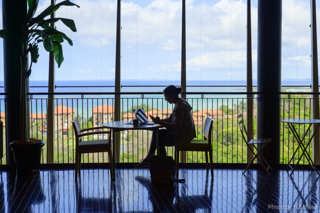 こちらも沖縄科学技術大学院大学にて。先生か学生かはわかりませんが、エメラルドグリーンの海を背景に、学内のオシャレなカフェでお仕事をされていました。こんな美しい環境でリラックスできるからこそ、素晴らしいアイデアや新しい発想が生まれるのかなと、想像が膨らみました。