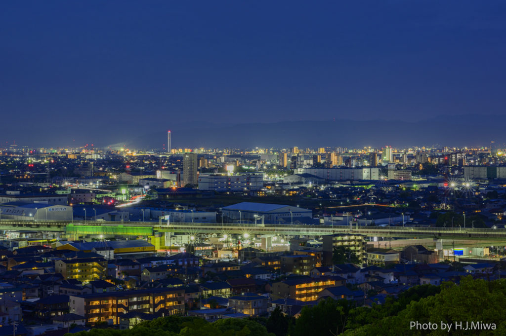 広角で撮影地の周辺を撮りました。右側に見える夜景を、中望遠で切り取るのがオススメです。外灯があるので、日没後も怖い思いをしなくてすみます。