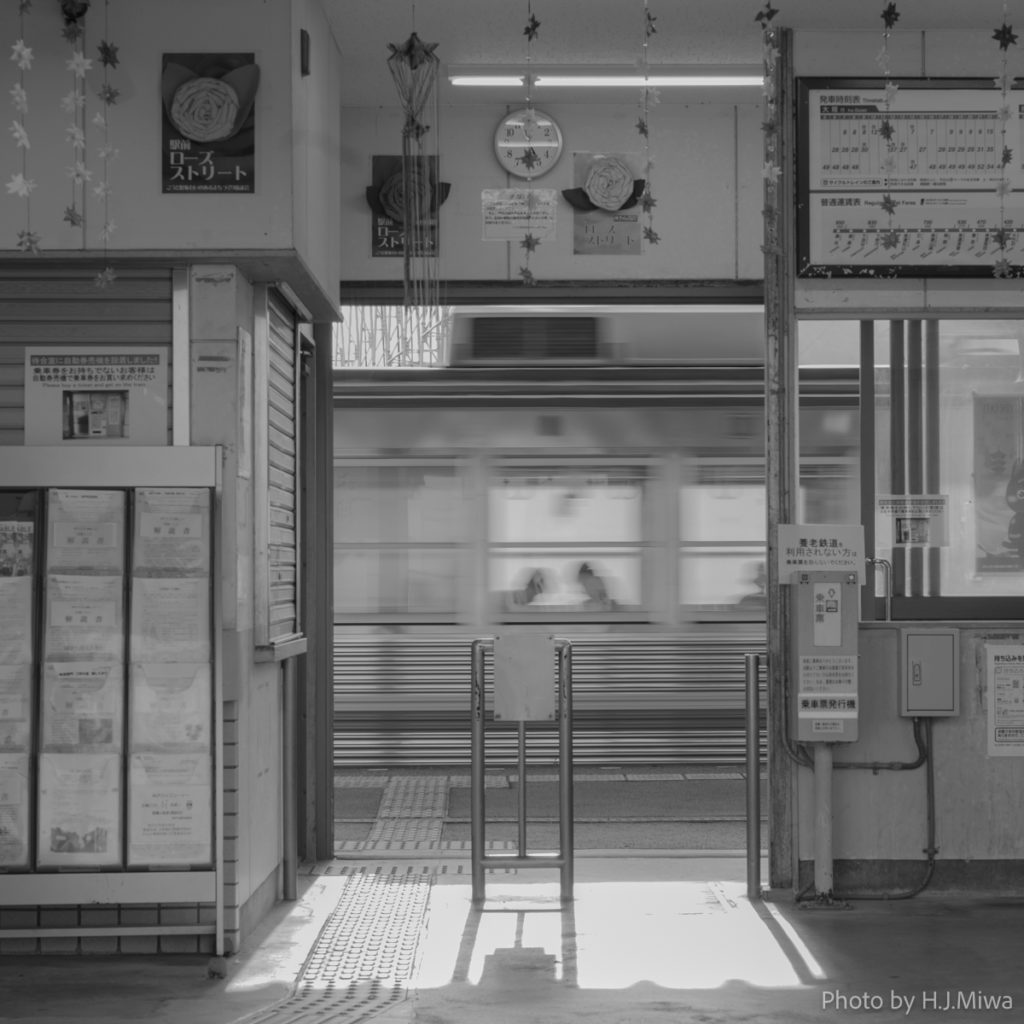 養老鉄道 養老線の広神戸駅です。養老線は大垣駅から揖斐駅までの約11kmを25分で結ぶローカル線で、ここ広神戸駅はその途中にある無人駅です。全ての列車は各駅に停車します。ちょうど列車がやってきたので、速度が落ちてきたところをスローシャッターで一枚撮りました。1時間に数本と決して便数が多くはありませんが、町の方々にとって重要な交通手段です。